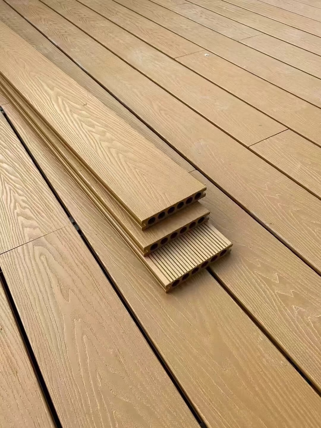 方孔空芯塑木地板是立美针对特定需求设计的特色产品。其 “方孔空芯” 结构不仅减轻了地板重量,便于运输与安装,还增强了地板的透气性与排水性,在雨季或潮湿环境中能快速排出水分,减少积水对地板的影响。方孔空芯塑木地板的承重能力经过优化,能满足日常行人与轻型家具的放置需求,适用于阳台、走廊等空间。