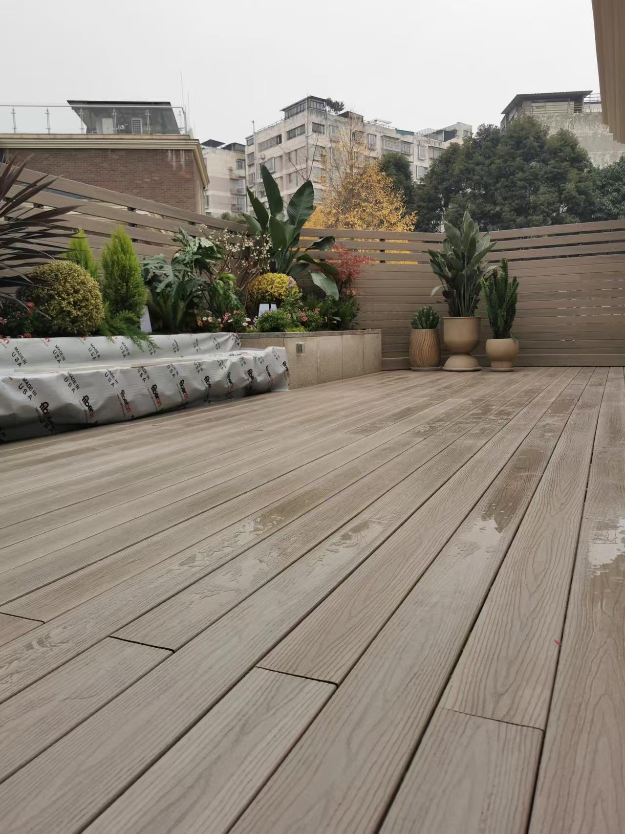 塑木地板(又称木塑地板)的核心优势在于融合木材质感与塑料耐候性,无需频繁维护即可适应户外复杂环境,这也是其在东莞户外场景中广泛应用的关键。其中,WPC 塑木地板以木质纤维与塑料为主要原料,通过特殊工艺制成,兼具良好的韧性与承重能力,即便长期暴露在雨水、阳光下,也不易变形、开裂,适配花园步道、露台等高频使用区域;共挤塑木地板则在表层增加共挤耐磨层,进一步强化抗刮擦、抗老化性能,适合人流密集的园林步道或商业户外空间,能长期保持表面美观。